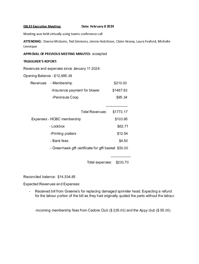 EBLES Executive Meeting:Date: February 8 2024Meeting was held virtually using teams conference call ATTENDING: Dianne McGuire, Ted Simmons, Jennie Hutchison, Claire Vessey, Laura Foxford, Michelle Levesque APPROVAL OF PREVIOUS MEETING MINUTES: accepted TREASURERS REPORT: Revenues and expenses since January 11 2024: Opening Balance $12,995.38 Revenues Membership$210.00Insurance payment for blower$1467.83Peninsula Coop$95.34 ___ Total Revenues:$1773.17Expenses HCBC membership$103