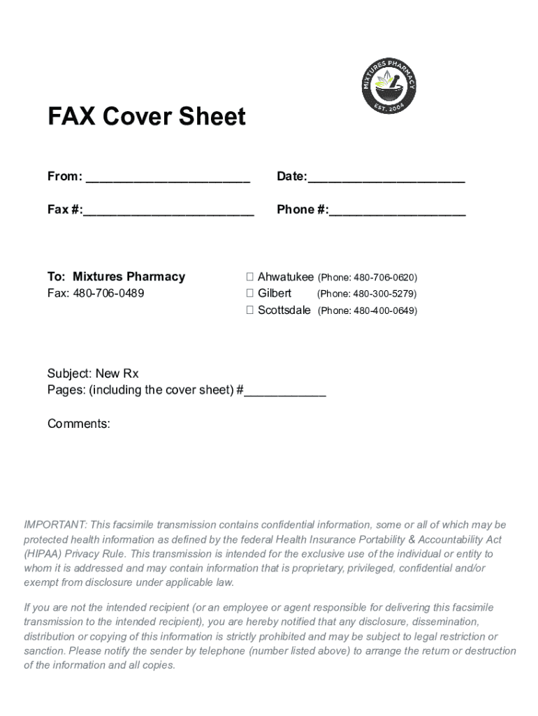 FAX Cover Sheet From: ___Date:___Fax #:___Phone #:___To: Mixtures Pharmacy Fax: 4807060489 Ahwatukee (Phone: 4807060620) (Phone: 4803005279) Gilbert Scottsdale (Phone: 4804000649)Subject: New Rx Pages: (including the cover sheet) #___ Comments:IMPORTANT: This facsimile transmission contains confidential information, some or all of which may be protected health information as defined by the federal Health Insurance Portability & Accountability Act (HIPAA) Privacy Rule