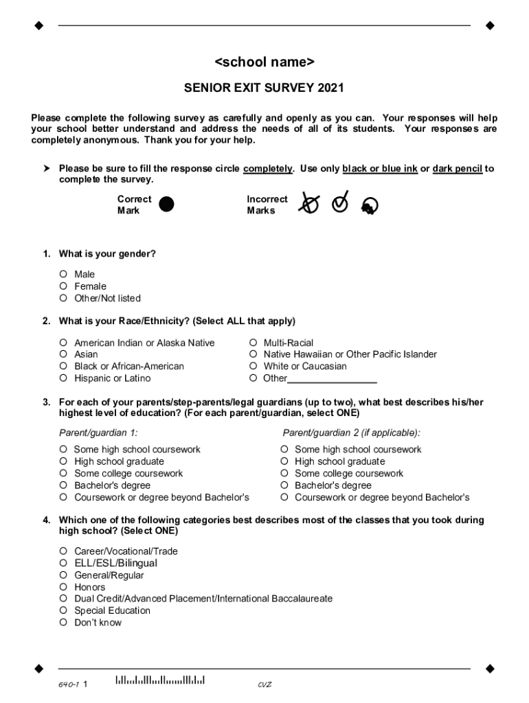 school name SENIOR EXIT SURVEY 2021 Please complete the following survey as carefully and openly as you can. Your responses will help your school better understand and address the needs of all of its students. Your responses are completely anonymous. Thank you for your help. Please be sure to fill the response circle completely. Use only black or blue ink or dark pencil to complete the survey. Correct MarkIncorrect Marks1. What is your gender? Male Female Other/Not listed 2