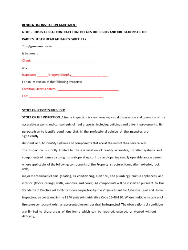 RESIDENTIAL INSPECTION AGREEMENT NOTE THIS IS A LEGAL CONTRACT THAT DETAILS THE RIGHTS AND OBLIGATIONS OF THE PARTIES. PLEASE READ ALL PAGES CAREFULLY This Agreement dated: ___ is between: Client:___ and Inspector: ___Gregory Murphy___ For an inspection of the following Property: Common Street Address: ___ Fee: ___SCOPE OF SERVICES PROVIDED SCOPE OF THE INSPECTION: A home inspection is a noninvasive, visual observation and operation of the accessible systems and components of real property,...