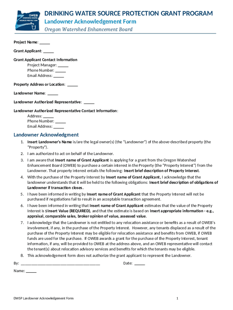 Understanding the DWSP Landowner Acknowledgement Template Form