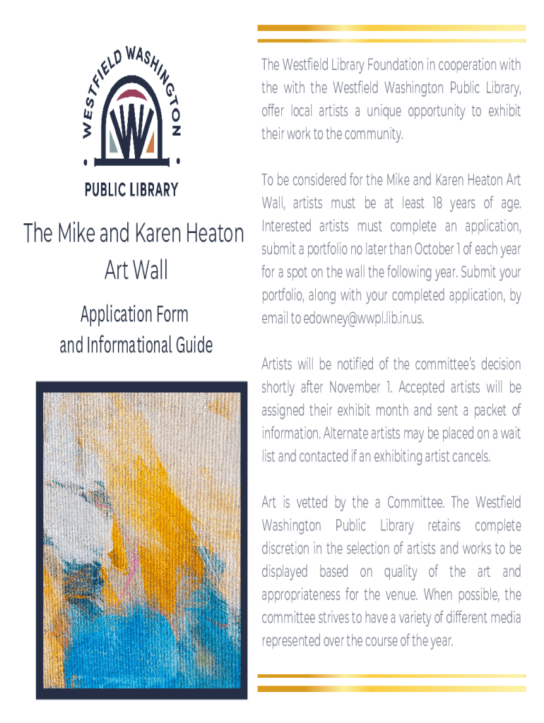 The Westfield Library Foundation in cooperation with the Westfield Washington Public Library, offer local artists a unique opportunity to exhibit their work to the community. The Mike and Karen Eaton