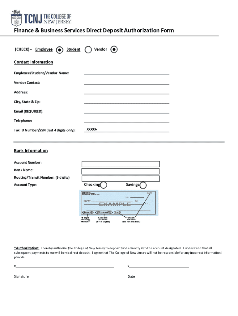 Get the free Finance & Business Services Direct Deposit Authorization Form - treasurer tcnj
