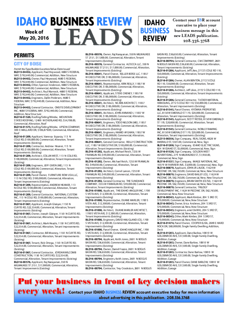 ID IDAHO AHO BUSINES BUSINESSS REVIEW Week of May 20, 2016PERMITS PERMITSLEADSCITY OF BOISE Permit No/Type/Builder/Location/Value/Date Issued CITY OF BOISEBLD1500780, Roofing/Siding/Windw, HOBSON
