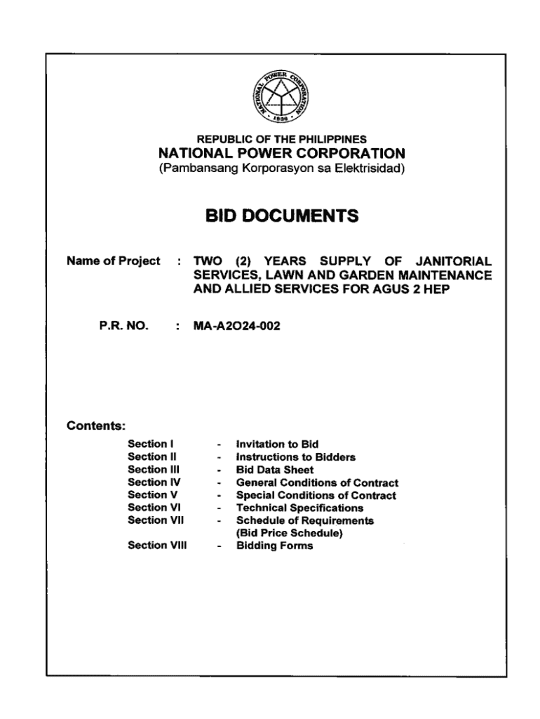 REPUBLIC OF THE PHILIPPINESNATIONAL POWER CORPORATION (Pambansang Korporasyon sa Elektrisidad)BID DOCUMENTS Name of ProjectP.R. NO.TWO (2) YEARS SUPPLY OF JANITORIAL SERVICES, LAWN AND GARDEN MAINTENANCE AND ALLIED SERVICES FOR AGUS 2 HEP MAA2024002Contents: Section 1 Section II Section III Section IV Section V Section VI Section VII Section VIIIinvitation to Bid Instructions to Bidders Bid Data Sheet General Conditions of Contract Special Conditions of Contract Technical Specifications Schedule