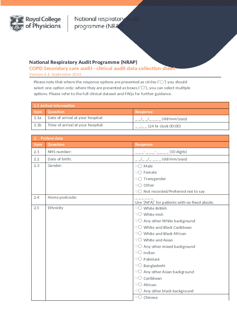 The National Respiratory Audit Programme form is a critical document that captures extensive data about patients with respiratory conditions, including asthma and COPD. It is designed to ensure that health professionals input detailed and accurate information, enabling the NRAP to assess clinical services and patient outcomes effectively.