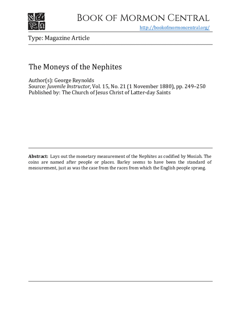 http://bookofmormoncentral.org/Type: Magazine Article Moneys of the NephitesAuthor(s): George Reynolds