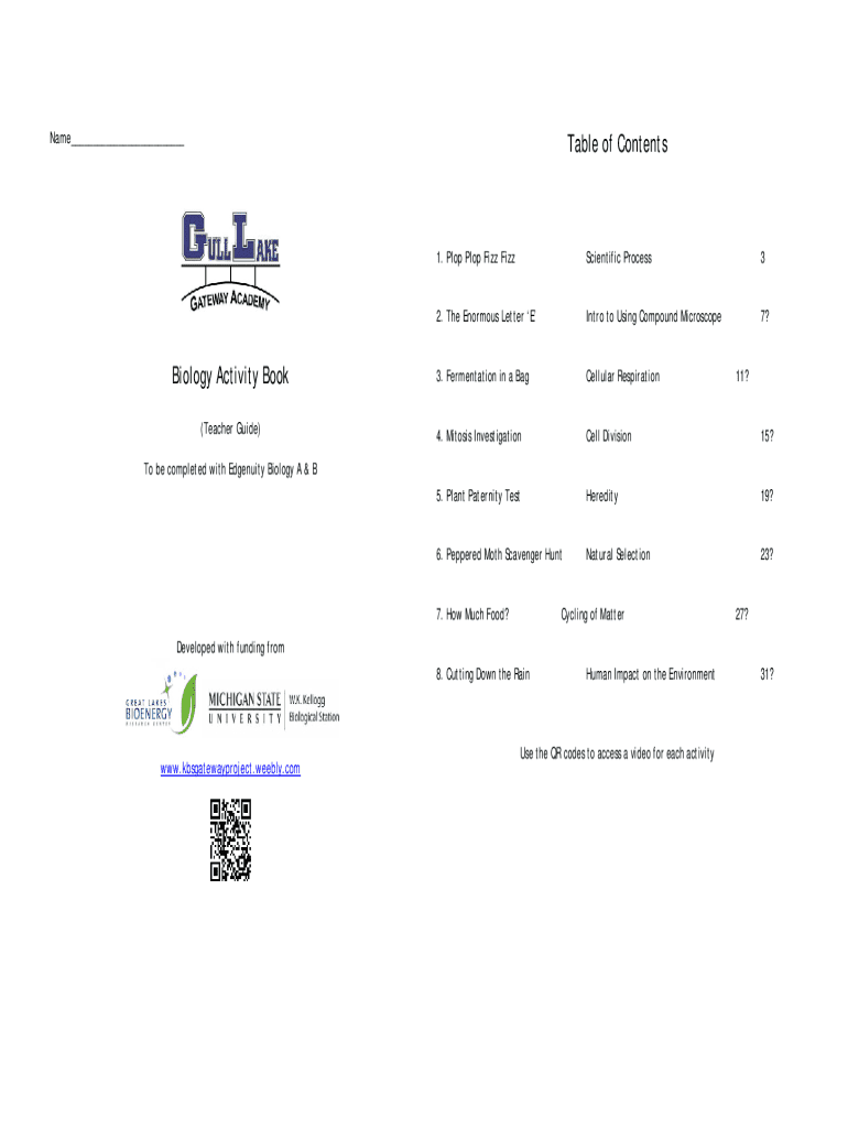 Name___Table of ContentsBiology Activity Book (Teacher Guide)1. Plop Plop Fizz FizzScientific Process32. The Enormous Letter EIntro to Using Compound Microscope7?3. Fermentation in a BagCellular Respiration4. Mitosis InvestigationCell Division15?5. Plant Paternity TestHeredity19?6. Peppered Moth Scavenger HuntNatural Selection23?11?To be completed with Edgenuity Biology A & B7. How Much Food?Cycling of Matter27?Developed with funding from 8