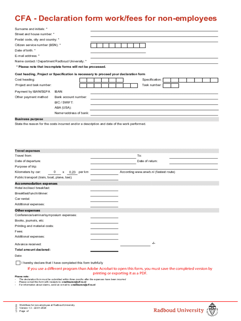 CFA Declaration form work/fees for nonemployees Surname and initials: * Street and house number: * Postal code, city and country: * Citizen service number (BSN): * Date of birth: * Email address: * Name contact / Department Radboud University: * * Please note that incomplete forms will not be processed. Cost heading, Project or Specification is necessary to proceed your declaration form Cost heading:Specification:Project and task number:Task number:Payment by IBAN/SEPAIBAN:Other payment