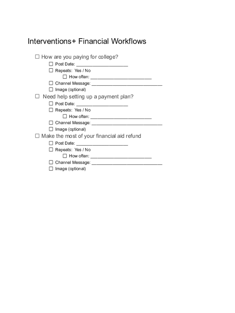 Interventions+ Financial Workflows How are you paying for college? Post Date: ___ Repeats: Yes / No How often: ___ Channel Message: ___ Image (optional)Need help setting up a payment plan? Post Date: ___ Repeats: Yes / No How often: ___ Channel Message: ___ Image (optional)Make the most of your financial aid refund Post Date: ___ Repeats: Yes / No How often: ___ Channel Message: ___ Image (optional)