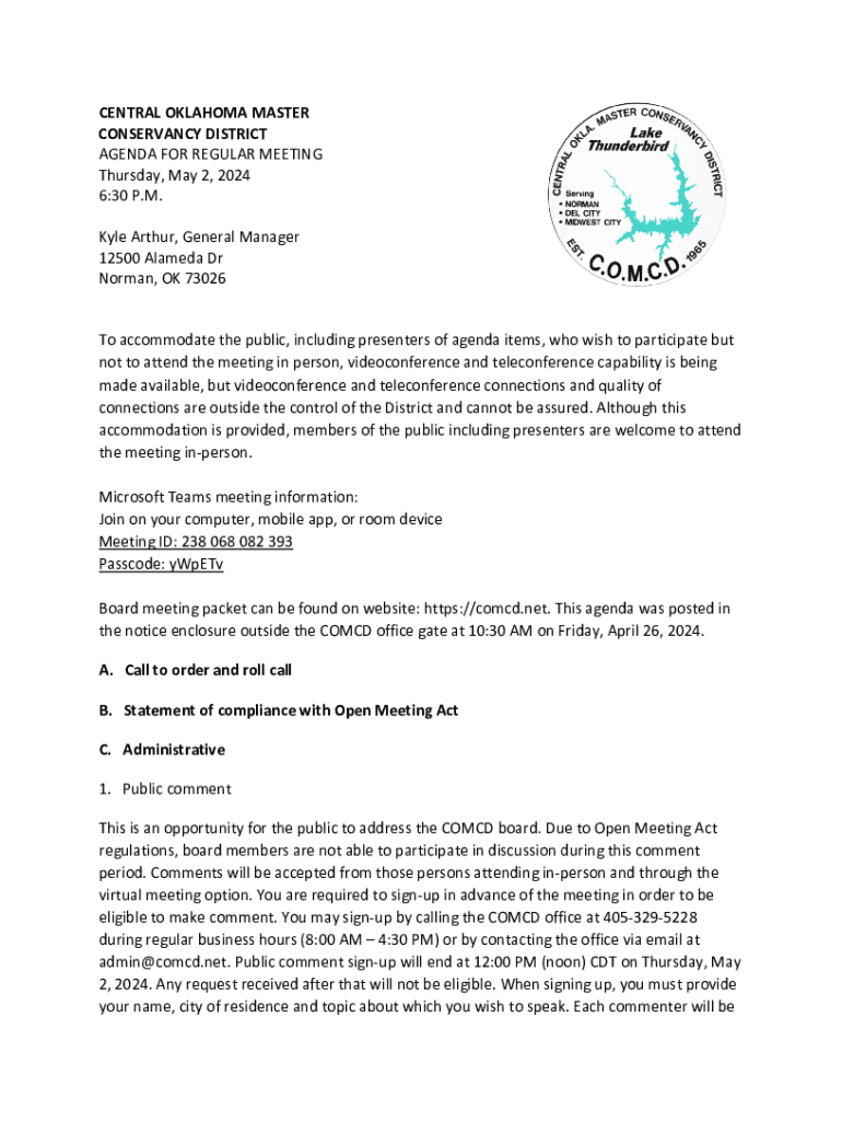 CENTRAL OKLAHOMA MASTER CONSERVANCY DISTRICT AGENDA FOR REGULAR MEETING Thursday, May 2, 2024 6:30 P.M. Kyle Arthur, General Manager 12500 Alameda Dr Norman, OK 73026To accommodate the public, including