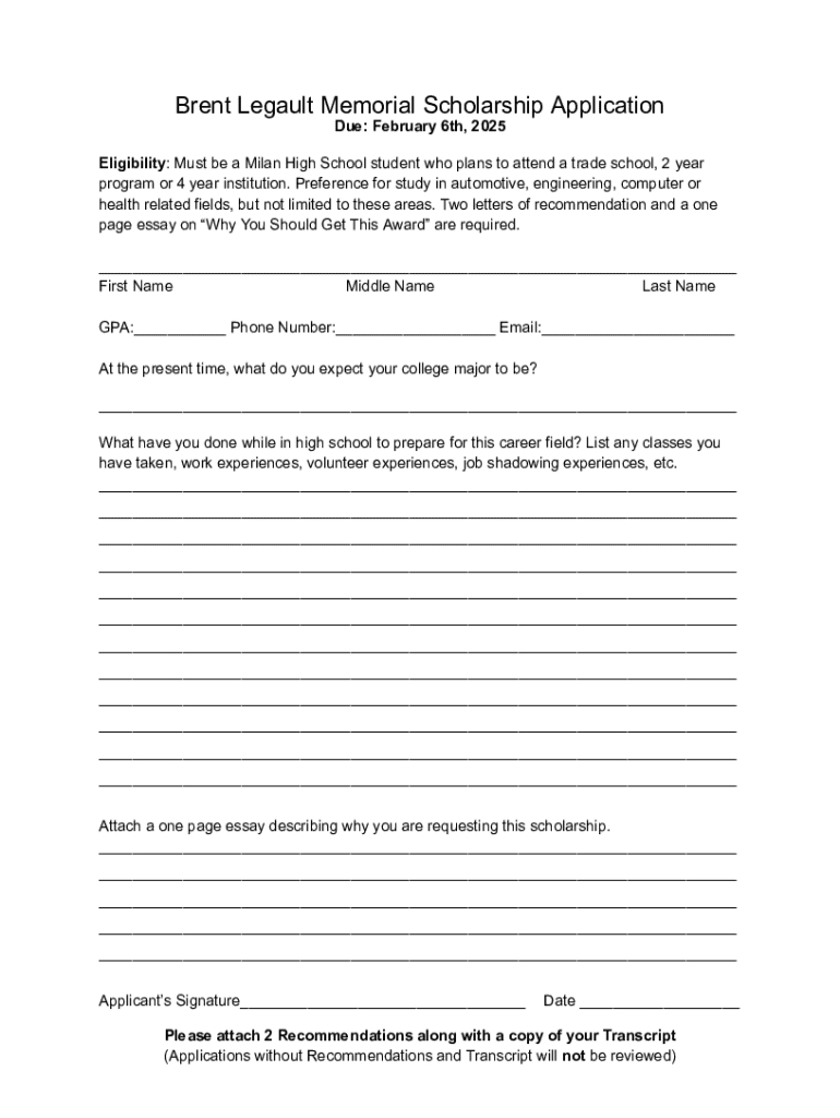 Applying for the Brent Legault Memorial Scholarship requires several key documents, ensuring that each candidate is assessed thoroughly. These include: