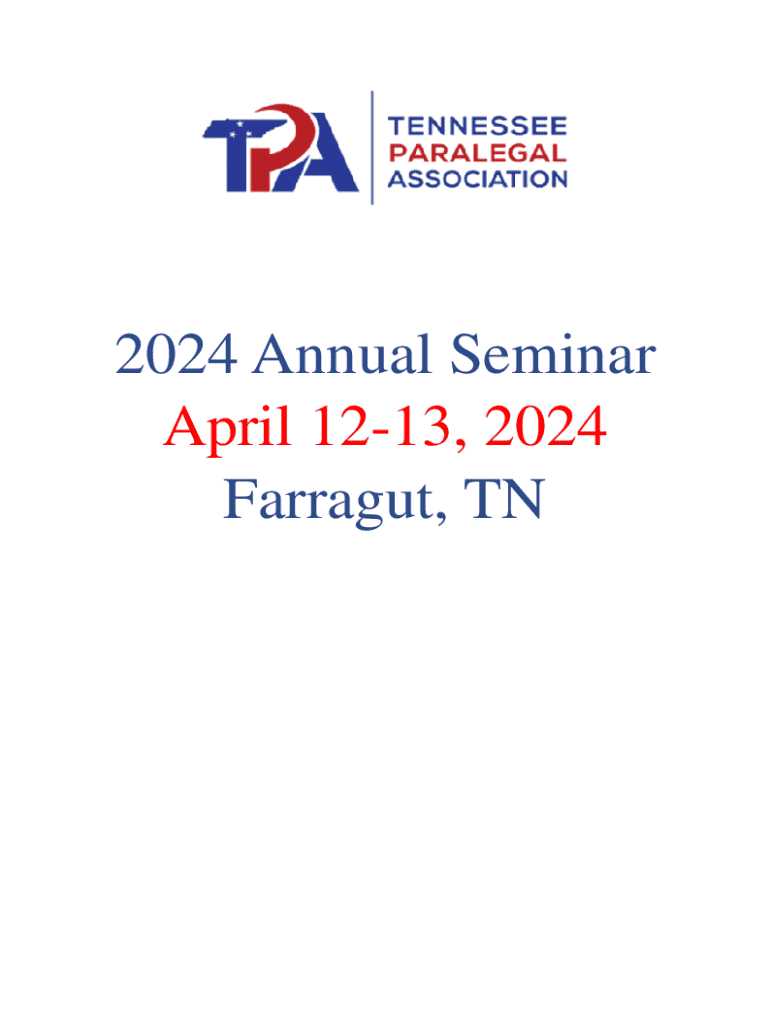 2024 Annual Seminar April 1213, 2024 Farragut, TN Friday, April 12, 2024 9:00 a.m.TPA 4th Quarter Governing Board Meeting Open to All TPA Members11:00 a.m. Registration Opens11:45 a.m. Opening Remarks