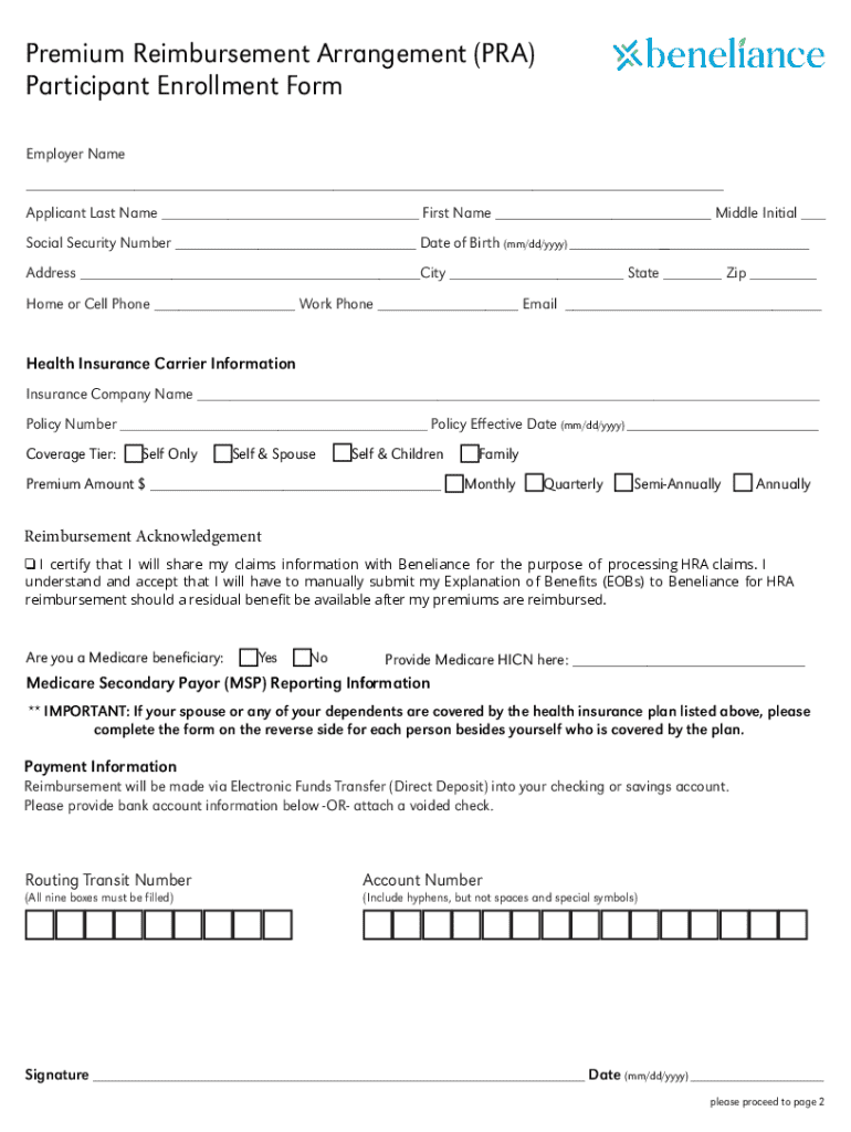 Premium Reimbursement Arrangement (PRA) Participant Enrollment Form Employer Name ___ Applicant Last Name ___ First Name ___ Middle Initial ___ Social Security Number ___ Date of Birth (mm/dd/yyyy)