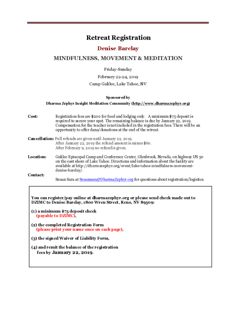 Retreat Registration Denise Barclay MINDFULNESS, MOVEMENT & MEDITATION FridaySunday February 2224, 2019 Camp Galilee, Lake Tahoe, NV Sponsored by Dharma Zephyr Insight Meditation Community (http://www.dharmazephyr.org)Cost:Registration