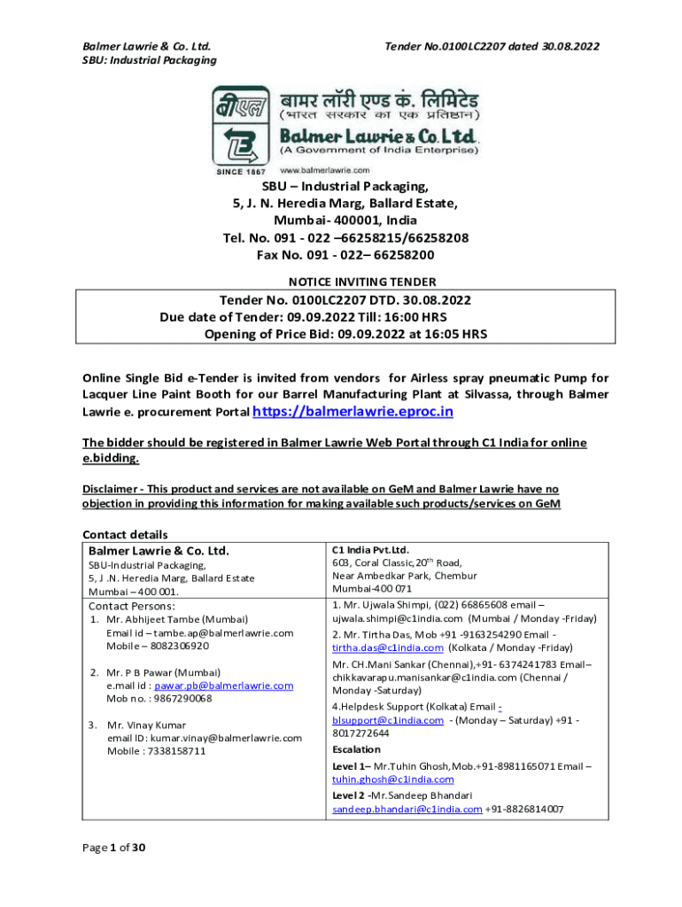 Balmer Lawrie & Co. Ltd. SBU: Industrial PackagingTender No.0100LC2207 dated 30.08.2022SBU Industrial Packaging, 5, J. N. Heredia Marg, Ballard Estate, Mumbai 400001, India Tel. No. 091 022 66258215/66258208 Fax No. 091 022 66258200 NOTICE INVITING TENDERTender No. 0100LC2207 DTD. 30.08.2022 Due date of Tender: 09.09.2022 Till: 16:00 HRS Opening of Price Bid: 09.09.2022 at 16:05 HRS Online Single Bid eTender is invited from vendors for Airless spray pneumatic Pump for Lacquer