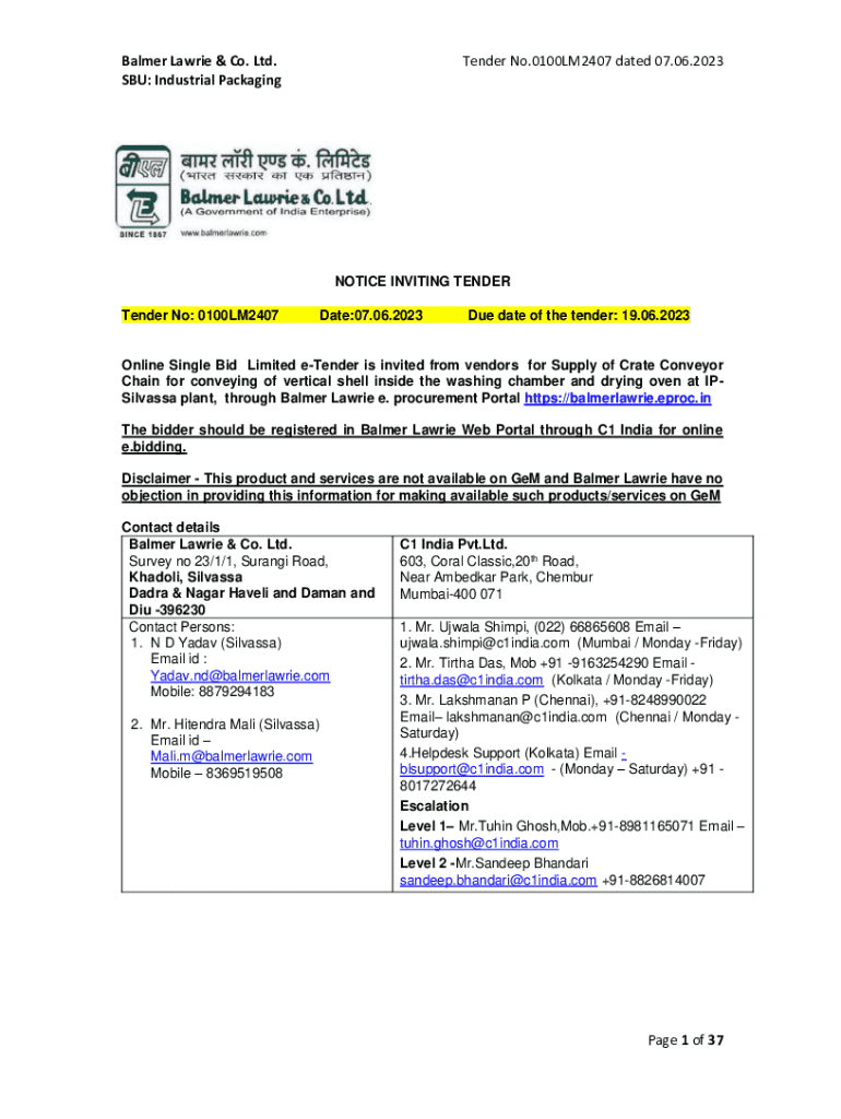 Balmer Lawrie & Co. Ltd. SBU: Industrial PackagingTender No.0100LM2407 dated 07.06.2023NOTICE INVITING TENDER Tender No: 0100LM2407Date:07.06.2023Due date of the tender: 19.06.2023Online Single Bid Limited eTender is invited from vendors for Supply of Crate Conveyor Chain for conveying of vertical shell inside the washing chamber and drying oven at IPSilvassa plant, through Balmer Lawrie e. procurement Portal https://balmerlawrie.eproc.in The bidder should be registered in Balmer Lawrie Web...