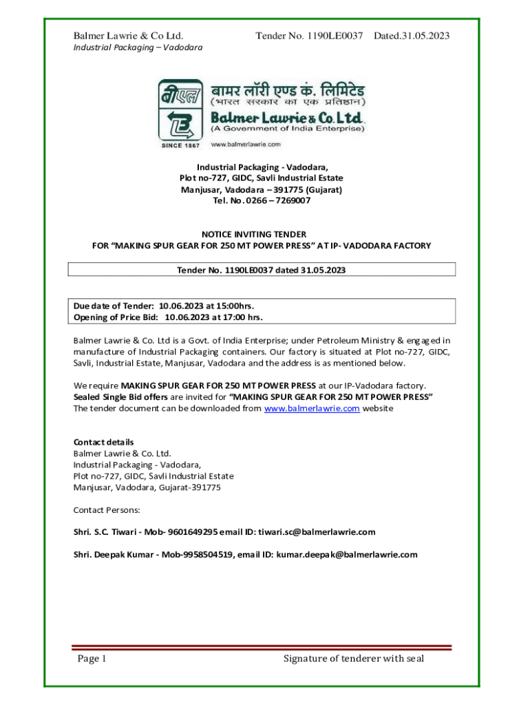 Get the free Balmer Lawrie & Co Ltd. Tender No. 1190LE0037 Dated.31.05. ...