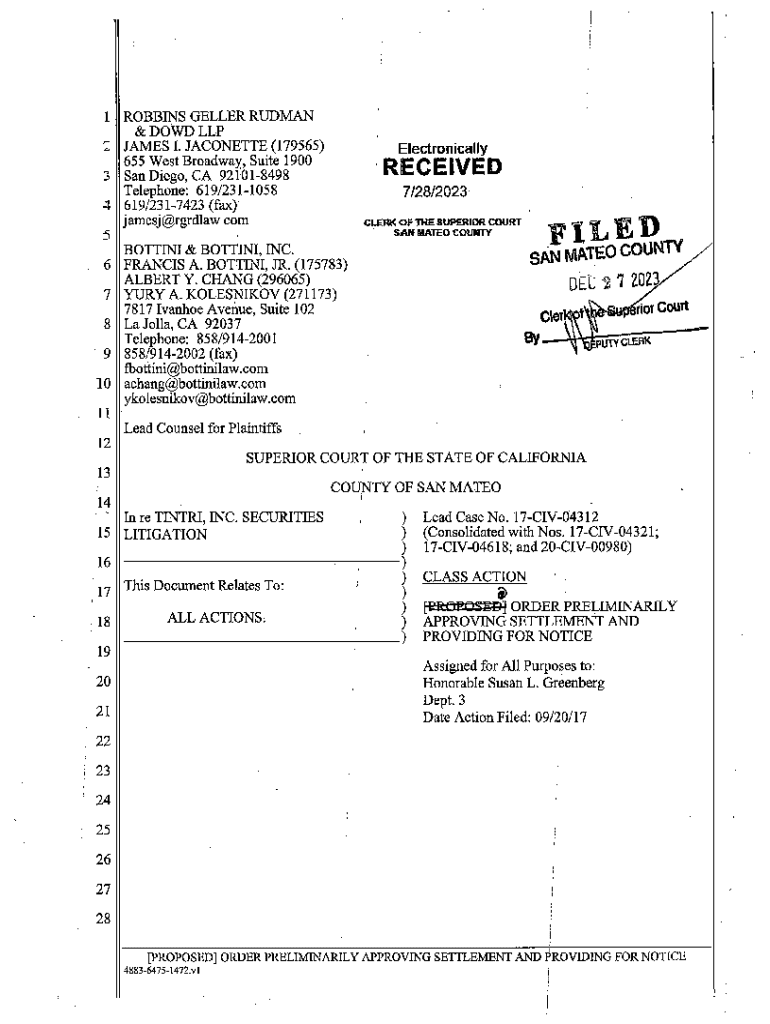 t3] U.)ROBBINS GELLER RUDMAN & DOWD LLP.JAMES I. JACONETTE (179565)Electronically655 West Broadway, Suite 1900 San Diego, CA 921018498 Telephone: 619/23 11058 619/23 17423 (fax) J\'ames\'J@rgrdlaw com.RECEIVED 7/28/2023 _msgamgfmmm.BOTTINI & BOTTINI, INC. FRANCIS A. BOTTINI, IR. (175783) ALBERT Y. CHANG (296065) YURY A. KOLESNIKOV (271 173)DEL7817 Ivanhoe Avenue, Suite 10211\'SUPERIOR COURT OF THE STATE OF CALIFORNIACOUNTY OF SAN MATEO SIn re TINTRI, INC