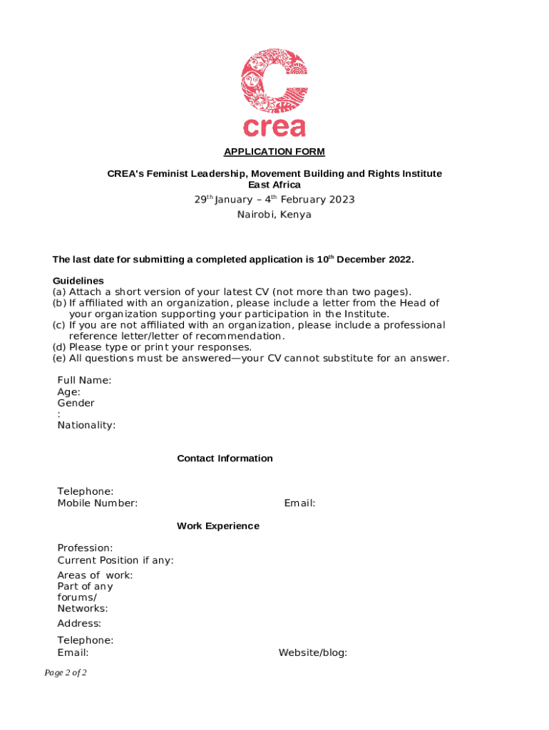 The Feminist Leadership, Movement Building and Rights Institute. Application is a Word document which can be filled-out and signed for specified purpose. In that case, it is provided to the actual addressee to provide certain details and data. The completion and signing is possible in hard copy or using an appropriate tool like PDFfiller. These services help to fill out any PDF or Word file without printing out. While doing that, you can customize its appearance depending on the needs you have and put legit digital signature. Once finished, the user sends the Feminist Leadership, Movement Building and Rights Institute. Application to the respective recipient or several recipients by mail and even fax. PDFfiller has a feature and options that make your blank printable. It has different options when printing out. It does no matter how you distribute a document - physically or by email - it will always look well-designed and clear. To not to create a new document from the beginning every time, turn the original file as a template. Later, you will have an editable sample.