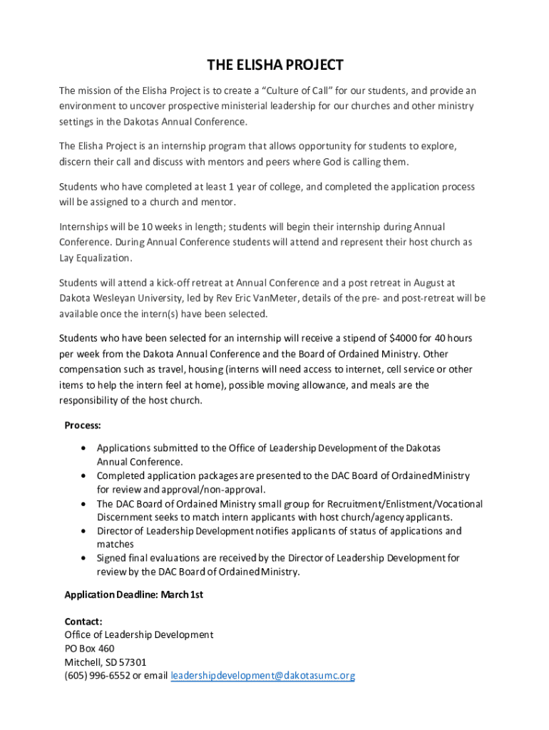 THE ELISHA PROJECT The mission of the Elisha Project is to create a Culture of Call for our students, and provide an environment to uncover prospective ministerial leadership for our churches and other ministry settings in the Dakotas Annual Conference. The Elisha Project is an internship program that allows opportunity for students to explore, discern their call and discuss with mentors and peers where God is calling them. Students who have completed at least 1 year of college, and completed