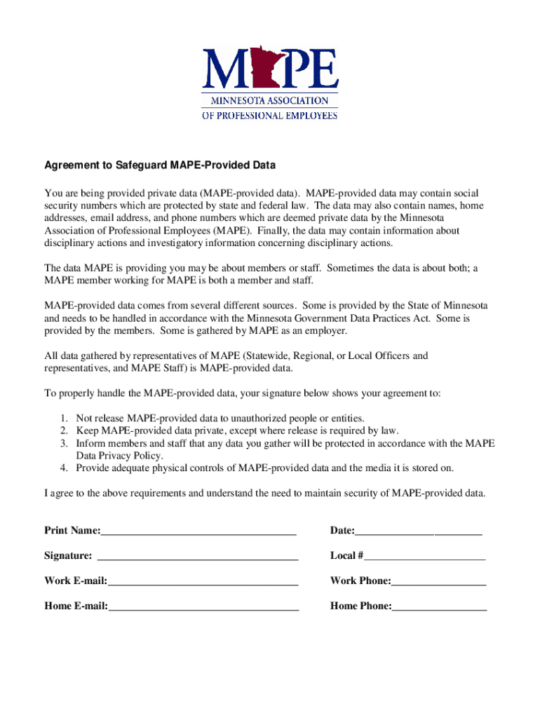 Agreement to Safeguard MAPEProvided Data You are being provided private data (MAPEprovided data). MAPEprovided data may contain social security numbers which are protected by state and federal law. The data may also contain names, home addresses, email address, and phone numbers which are deemed private data by the Minnesota Association of Professional Employees (MAPE). Finally, the data may contain information about disciplinary actions and investigatory information concerning disciplinary...