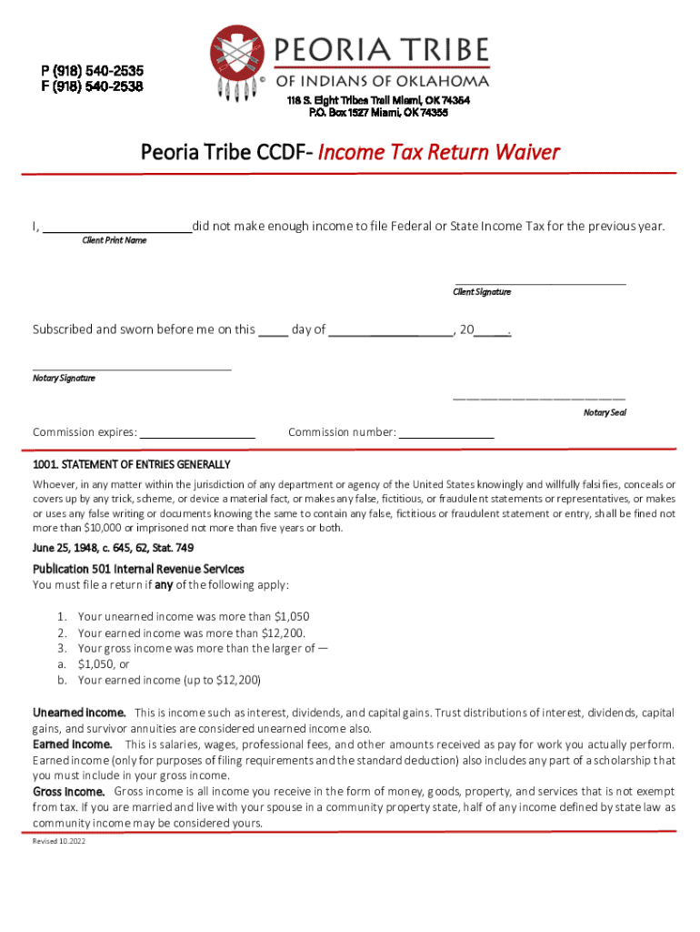 Peoria Tribe CCDF Income Tax Return Waiver I,___did not make enough income to file Federal or State Income Tax for the previous year. Client Print Name___ Client SignatureSubscribed and sworn before me on thisday of___, 20__.___ Notary Signature ___ Notary SealCommission expires:Commission number:1001. STATEMENT OF ENTRIES GENERALLY Whoever, in any matter within the jurisdiction of any department or agency of the United States knowingly and willfully falsifies, conceals or covers