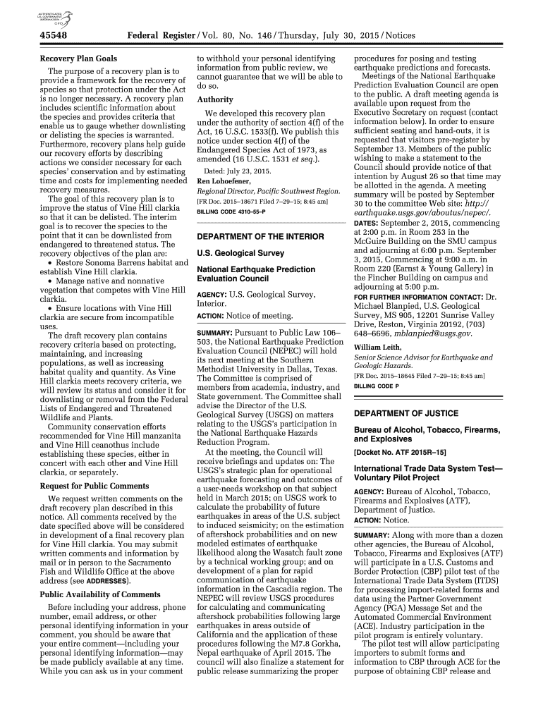 45548 Federal Register / Vol. 80, No. 146 / Thursday, July 30, 2015 / Notices Recovery Plan Goals The purpose of a recovery plan is to provide a framework for the recovery of species so that protection