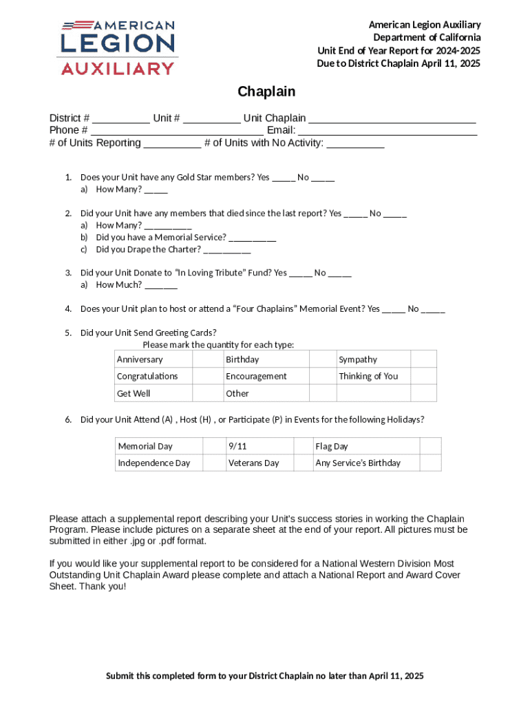 In addition to the Auxiliary Chaplain Support Program Form, there are several related forms that members may find useful. For example, travel forms related to chaplain activities help streamline logistics when attending events or training. Also, safety and emergency contact forms are essential for ensuring that chaplains can be reached efficiently in critical situations.