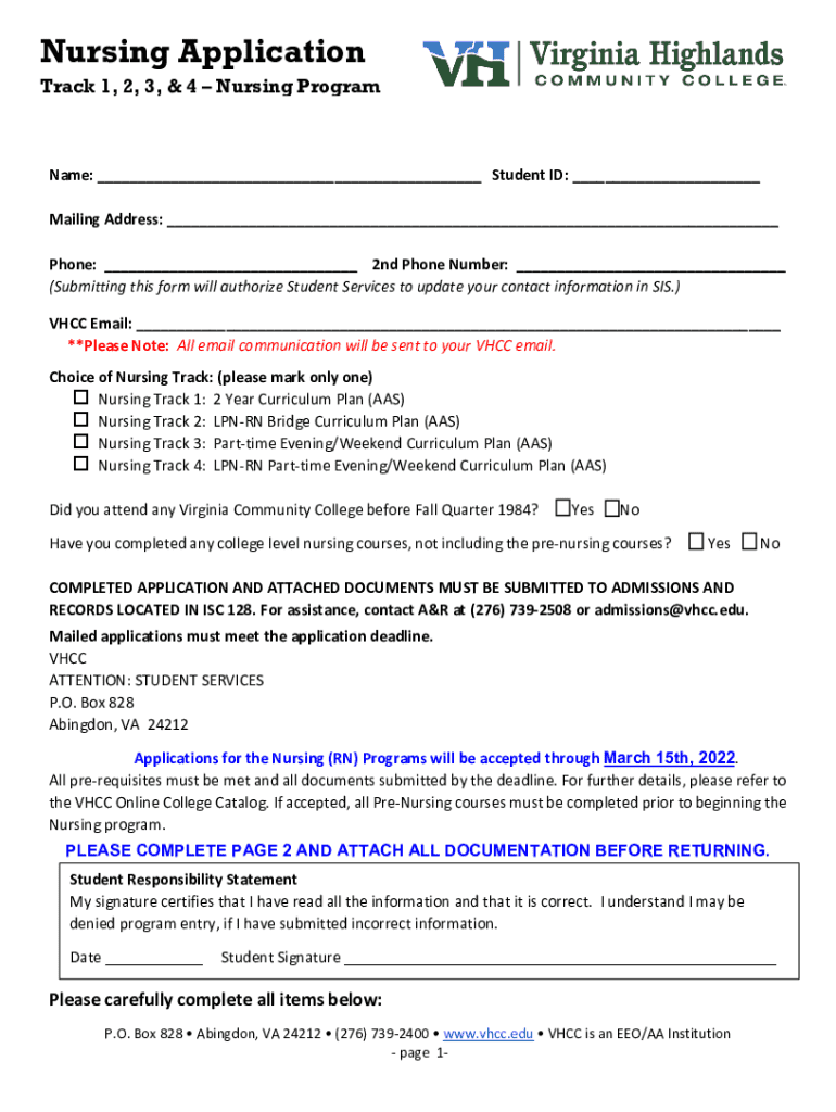 Nursing Application Track 1, 2, 3, & 4 Nursing ProgramName: ___ Student ID: ___ Mailing Address: ___ Phone: ___ 2nd Phone Number: ___ (Submitting this form will authorize Student Services to update