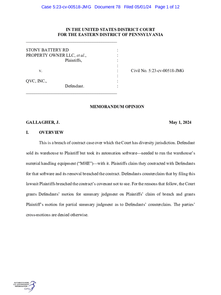 Case 5:23cv00518JMG Document 78 Filed 05/01/24 Page 1 of 12IN THE UNITED STATES DISTRICT COURT FOR THE EASTERN DISTRICT OF PENNSYLVANIA ___ STONY BATTERY RD PROPERTY OWNER LLC, et al., Plaintiffs,: