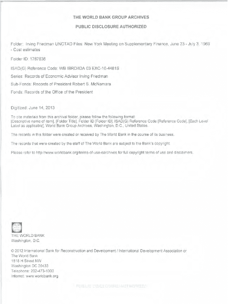 THE WORLD BANK GROUP ARCHIVES PUBLIC DISCLOSURE AUTHORIZEDFolder: Irving Friedman UNCTAD Files: New York Meeting on Supplementary Finance , June 23 July 3 , 1969 Cost estimates Folder I D: 1787636 I SAD ( G) Reference Code: WB IBRD/IDA 03 EXC1 04481 S Series : Records of Economic Advisor Irving Friedman SubFonds: Records of President Robert S. McNamara Fonds : Records of the Office of the PresidentDigitized: June 14, 2013 To cite materials from this archival folder , please follow the...