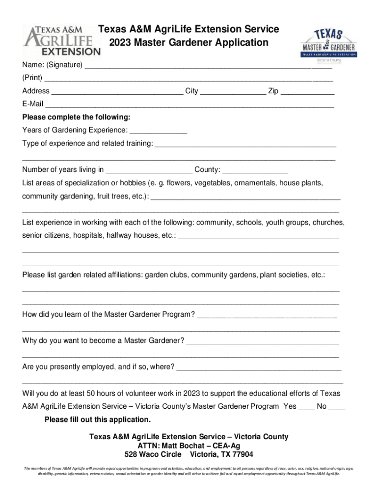 The Victoria County Master Gardener Form serves as the primary application document for individuals seeking to join the VCMGA. Its purpose is to collect essential information from prospective members, evaluating their gardening backgrounds, experiences, and commitment to community service. Filling out this form accurately is a significant step towards embarking on a rewarding journey in gardening education.