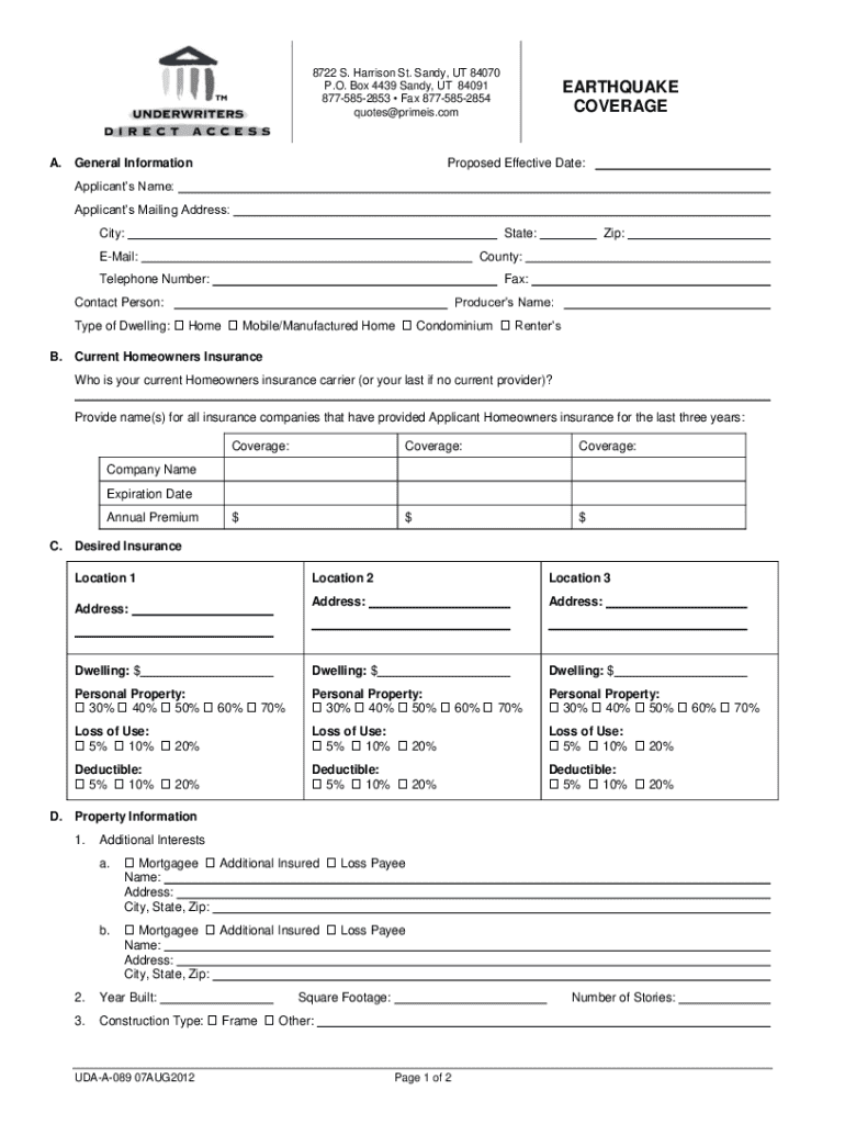 The earthquake coverage form is vital as it serves as the official document required to apply for this insurance. It outlines the necessary details needed to evaluate your application and determine your coverage limits, premium costs, and more. Understanding this form is the first step to ensuring adequate protection for your property and peace of mind in the event of an earthquake.