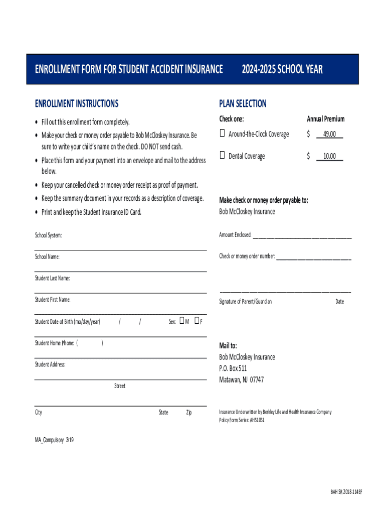 ENROLLMENT FORM FOR STUDENT ACCIDENT INSURANCE20242025 SCHOOL YEARENROLLMENT INSTRUCTIONSPLAN SELECTION Fill out this enrollment form completely. Make your check or money order payable to Bob McCloskey