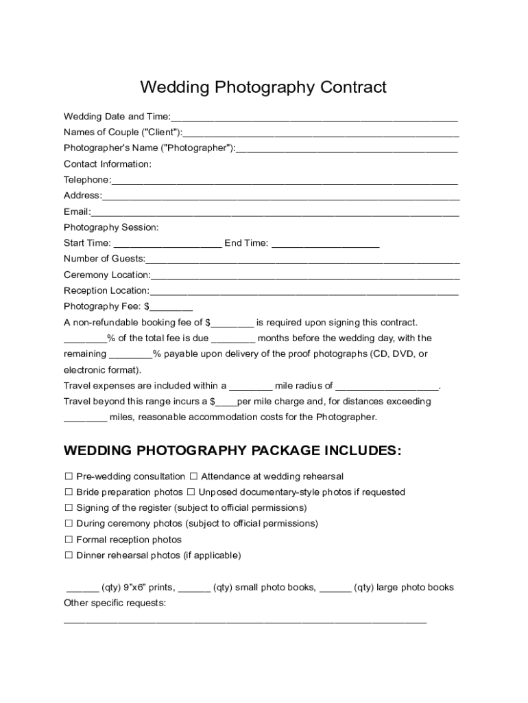 Creating a robust photography session contract involves detailing key components to ensure clarity and protection for both the photographer and client. The first crucial element is the scope of work. This section defines the specific services to be provided, such as the type of photoshoot, number of hours, and the photographer's creative input.