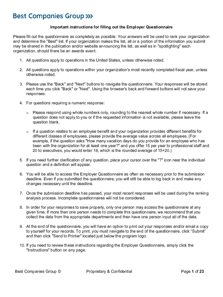 Important instructions for filling out the Employer Questionnaire Please fill out the questionnaire as completely as possible. Your answers will be used to rank your organization and determine the \"Best\" list. If your organization makes the list, all or a portion of the information you submit may be shared in the publication and/or website announcing the list, as well as in \"spotlighting\" each organization, should there be an awards event. 1. All questions apply to operations in the...