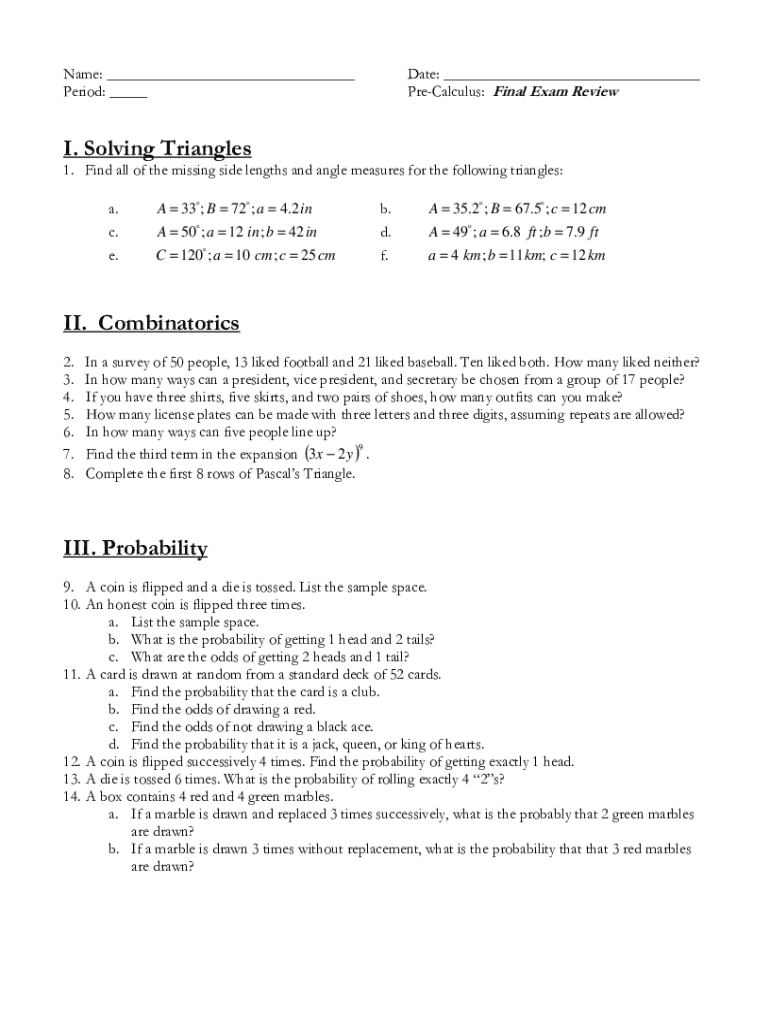 Name: ___ Period: ___Date: ___ PreCalculus: Final Exam ReviewI. Solving Triangles 1. Find all of the missing side lengths and angle measures for the following triangles: a. c. e.A 33 ; B 72 ; a 4.2 in A 50 ; a 12 in ; b 42 in C 120 ; a 10 cm ; c 25 cmb. d. f.A 35.2 ; B 67.5 ; c 12 cm A 49 ; a 6.8 ft ; b 7.9 ft a 4 km ; b 11 km; c 12 kmII. Combinatorics 2. 3. 4. 5. 6. 7. 8.In a survey of 50 people, 13 liked football and 21 liked baseball. Ten liked both