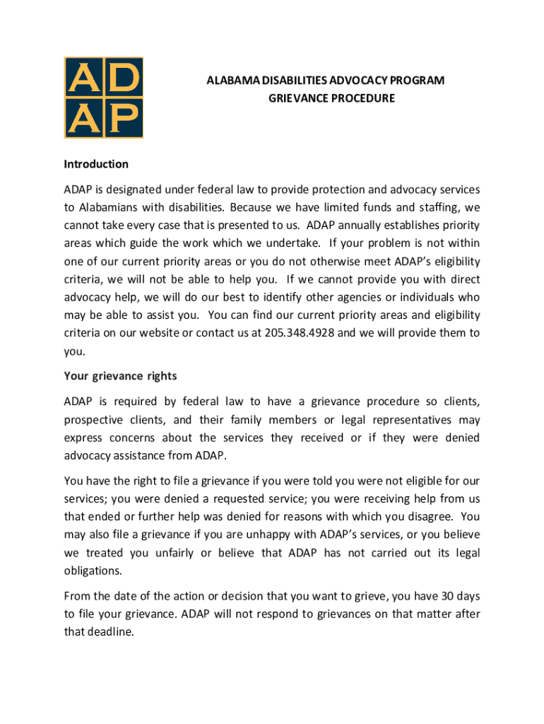 ALABAMA DISABILITIES ADVOCACY PROGRAM GRIEVANCE PROCEDUREIntroduction ADAP is designated under federal law to provide protection and advocacy services to Alabamians with disabilities. Because we have limited funds and staffing, we cannot take every case that is presented to us. ADAP annually establishes priority areas which guide the work which we undertake. If your problem is not within one of our current priority areas or you do not otherwise meet ADAPs eligibility criteria, we will not be...