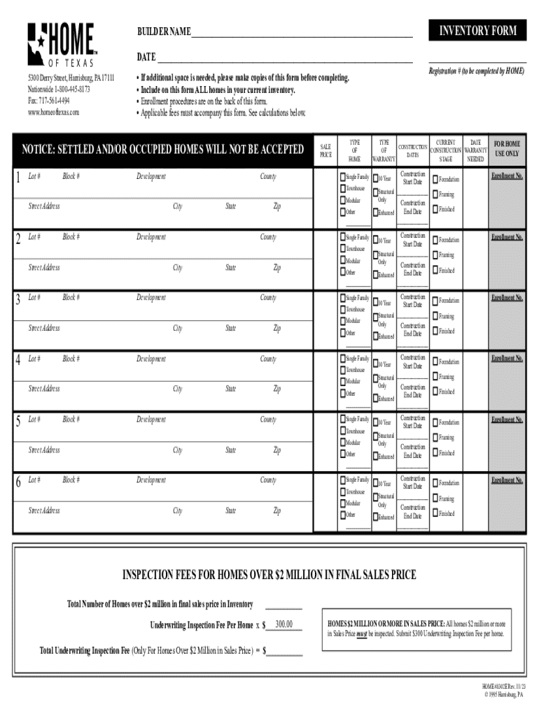 HOME OF TEXAS INVENTORY FORM ENROLLMENT PROCEDURES FOR EXISTING INVENTORY This form must be submitted with Application for Membership NOTE: This is an editable application. You may type in your answers to all questions on your computer. When finished, you must print the completed form and mail it back to us along with all applicable fees. GENERAL INSTRUCTIONS Use this form to enroll ALL homes which are currently in your inventory. Existing inventory, including homes under construction or...