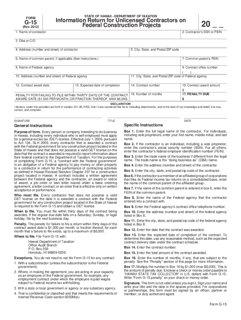 Get the free Form G-15, 2012, Information Return for Unlicensed Contractors on Federal Constructi...