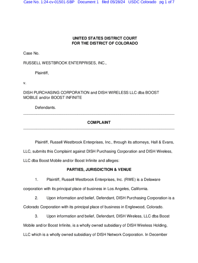 Case No. 1:24cv01501SBP Document 1 filed 05/28/24 USDC Colorado pg 1 of 7UNITED STATES DISTRICT COURT FOR THE DISTRICT OF COLORADO Case No. RUSSELL WESTBROOK ENTERPRISES, INC., Plaintiff, v. DISH