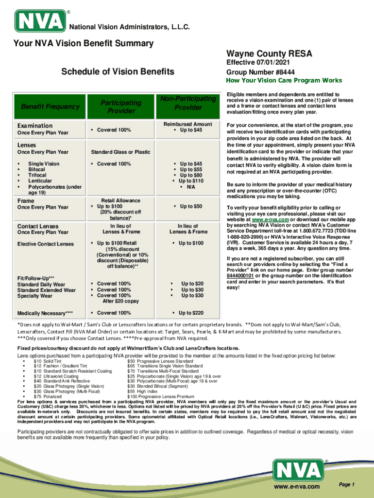 National Vision Administrators, L.L.C.Your NVA Vision Benefit Summary Wayne County RESA Effective 07/01/2021 Group Number #8444Schedule of Vision BenefitsHow Your Vision Care Program WorksBenefit Frequency Examination Once Every Plan YearParticipating Provider Covered 100%NonParticipating Provider Reimbursed Amount Up to $45Lenses Once Every Plan YearStandard Glass or Plastic Covered 100%Single Vision Bifocal Trifocal Lenticular Polycarbonates