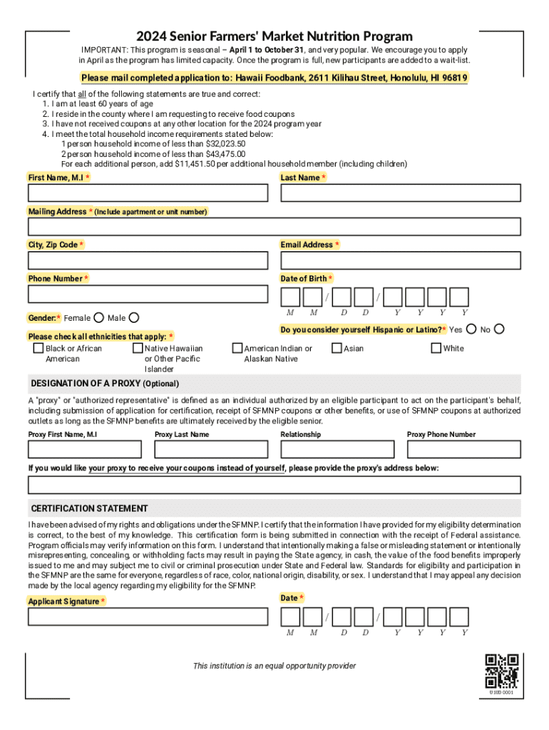 First, gather all necessary documentation, which typically includes proof of age and income. Then, complete the Senior Farmers Market Nutrition Application Form accurately. Finally, submit your application according to your local guidelines, which may include mailing it to a specified address or submitting it online.