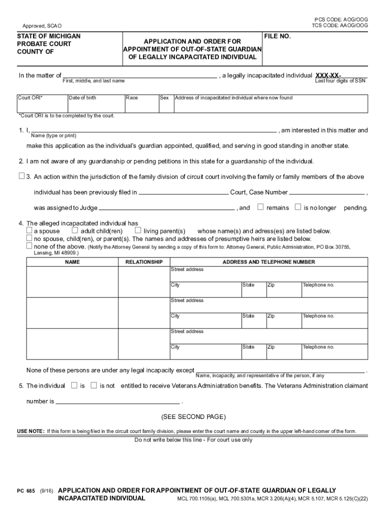 PCS CODE: AOG/OOG TCS CODE: AAOG/OOGApproved, SCAOSTATE OF MICHIGAN PROBATE COURT COUNTY OF In the matter ofAPPLICATION AND ORDER FOR APPOINTMENT OF OUTOFSTATE GUARDIAN OF LEGALLY INCAPACITATED INDIVIDUAL, a legally incapacitated individual XXXXXFirst, middle, and last nameCourt ORI*Date of birthFILE NO.Last four digits of SSNRaceSexAddress of incapacitated individual where now found*Court ORI is to be completed by the court.1. I,, am interested in this matter andName