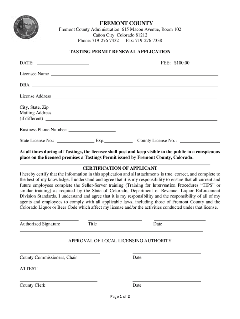 FREMONT COUNTY Fremont County Administration, 615 Macon Avenue, Room 102 Caon City, Colorado 81212 Phone: 7192767432 Fax: 7192767338 TASTING PERMIT RENEWAL APPLICATION DATE: ___FEE: $100.00Licensee Name ___ DBA ___ License Address ___ City, State, Zip ___ Mailing Address (if different) ___ Business Phone Number: ___ State License No.: ___ Exp.___County License No. : ___At all times during all Tastings, the licensee shall post and keep visible to the public in a conspicuous place on