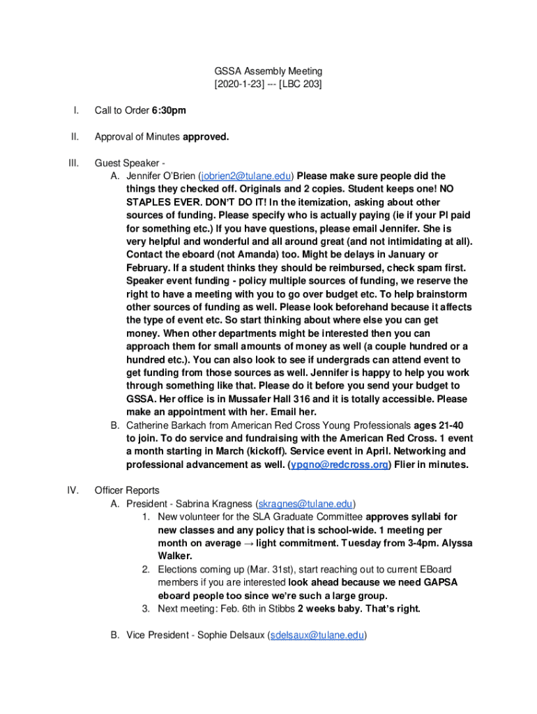GSSA Assembly Meeting [2020123] [LBC 203] I.Call to Order 6:30pmII.Approval of Minutes approved.III.Guest Speaker A. Jennifer OBrien (jobrien2@tulane.edu) Please make sure people did the things they