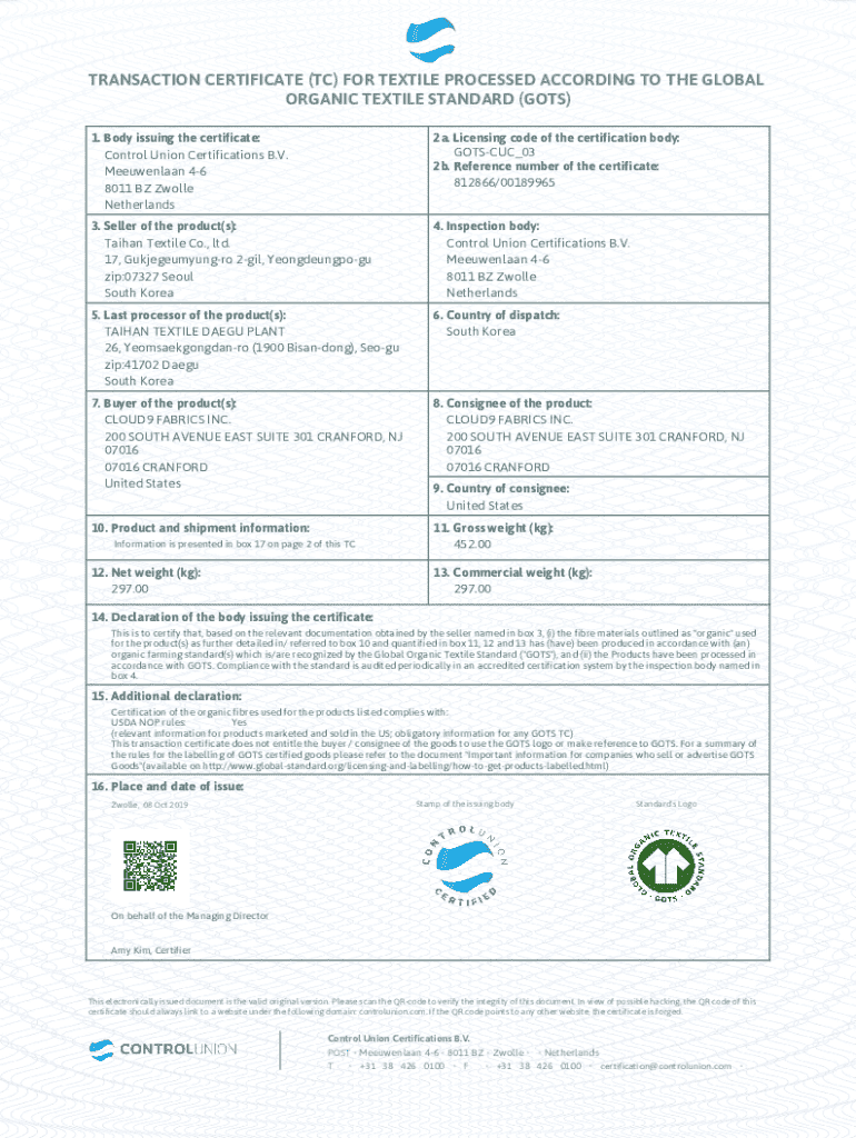 Get the free TRANSACTION CERTIFICATE (TC) FOR TEXTILE ...