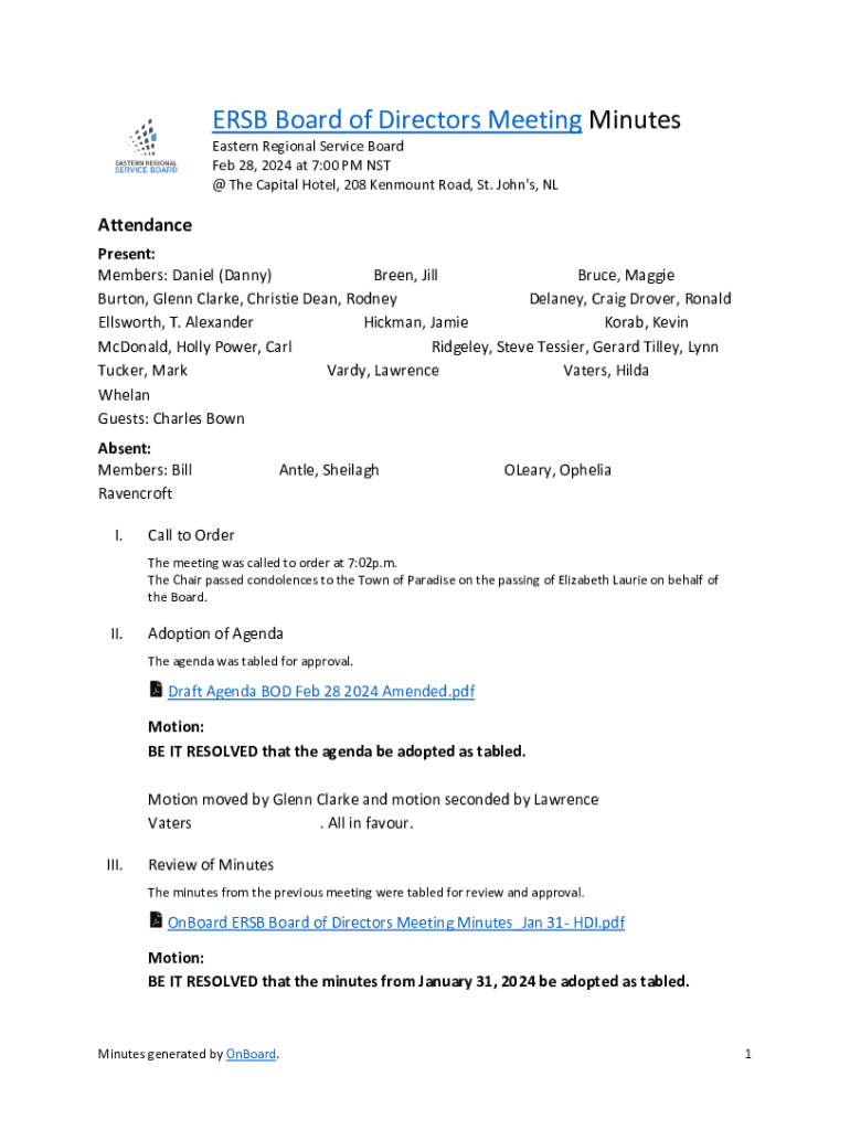 ESB Board of Directors Meeting Minutes Eastern Regional Service Board Feb 28, 2024 at 7:00 PM NST @ The Capital Hotel, 208 Ken mount Road, St. John\'s, Attendance Present: Members: Daniel (Danny)