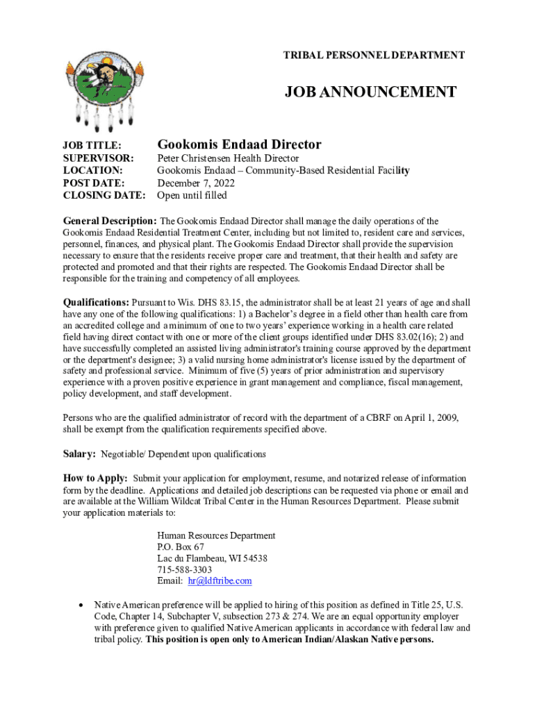 TRIBAL PERSONNEL DEPARTMENTJOB ANNOUNCEMENT JOB TITLE: SUPERVISOR: LOCATION: POST DATE: CLOSING DATE:Gookomis Endaad Director Peter Christensen Health Director Gookomis Endaad CommunityBased Residential Facility December 7, 2022 Open until filledGeneral Description: The Gookomis Endaad Director shall manage the daily operations of the Gookomis Endaad Residential Treatment Center, including but not limited to, resident care and services, personnel, finances, and physical plant. The Gookomis